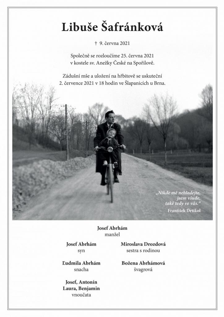„Od náhlého odchodu maminky Libuše Šafránkové celé naší rodině přichází nespočet soustrastných zpráv a dopisů. Žel není v našich silách poděkovat každému zvlášť. Proto bych chtěl všem, kteří si na maminku vzpomněli, co nejupřímněji touto cestou poděkovat. Naše rodina prožívá toto nelehké období velmi bolestně a všechna vaše slova účasti jsou pro nás silnou podporou,“ uvedl Josef Abrhám ml.